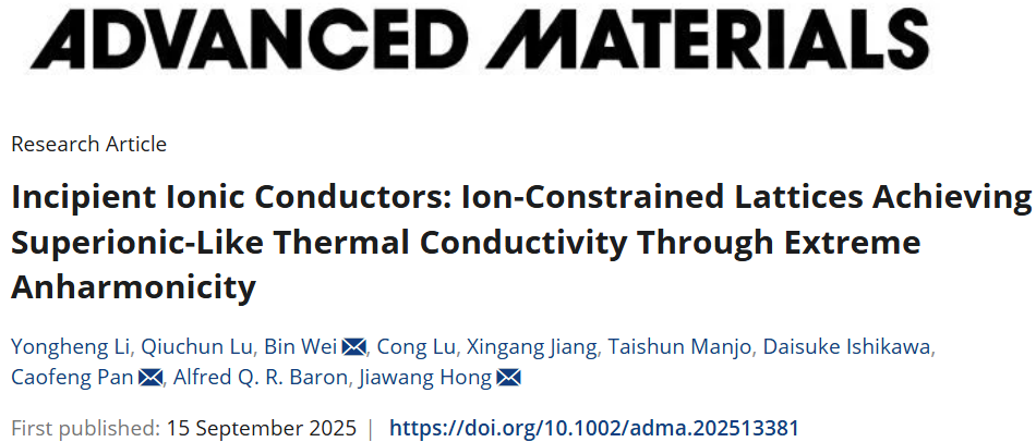 空天学院、临近空间环境特性及效应全国重点实验室洪家旺教授团队在离子导体的原子间非线性力研究中取得重要进展,相关成果以"Incipient Ionic Conductors: Ion-Constrained Lattices Achieving Superionic-Like Thermal Conductivity Through Extreme Anharmonicity"为题发表于国际期刊Advanced Materials。该团队针对超离子导体作为热电材料时由于高离子迁移率易引发金属沉积的问题,引入"初生离子导体"的概念(具有离子传导初始特征但未达到完全离子导体水平),发现金属卤化物(AX)x–(MX)1−x体系(A=Cu/Ag,M=K/Rb/Cs,X=Cl/Br/I)相比于超离子导体,稳定性更高并且保持低热导率(κ)。以CsCu2I3为典型,借助同步辐射实验和第一性原理计算,证实了Cu离子在CuI4四面体间呈现受限迁移。依靠大科学装置进行的非弹性X射线测试,结合理论计算表明该材料原子间存在强非线性力的作用(强非谐效应),这使得材料在一个方向出现极低的玻璃状热导率。研究发现,离子迁移率与热导率没有直接关联,初生离子导体的热导率与超离子导体相当,但稳定性更优。该研究为开发基于初生离子导体的超低热导-高稳定热电材料提供了依据。