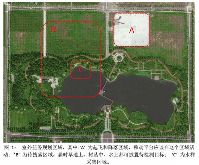 本届IMAV赛会比赛分为室外比赛和室内比赛两个部分。室外比赛主题为“海上钻井平台失火后的搜索与救援”,背景为某海上钻井平台发生泄漏事故,并引起平台局部起火,部分工作人员落入水中。搜救小组赶乘搜索舰船,携带无人机组快速前往平台附近执行任务。需要参赛无人机在移动平台上自动起飞和降落,快速生成目标区域全景图,采集钻井平台周围水样,最后在指定区域投放救生圈。室内比赛主题为“室内探测与搜救”,需要参赛无人机在室外启动,经导航至室内,完成一系列室内任务,最后返回起飞地点,其间需要无人机在狭窄空间内进出,快速生成目标区域全景图,对不同物体进行辨识、抓取,并且能移动平台上平稳降落。