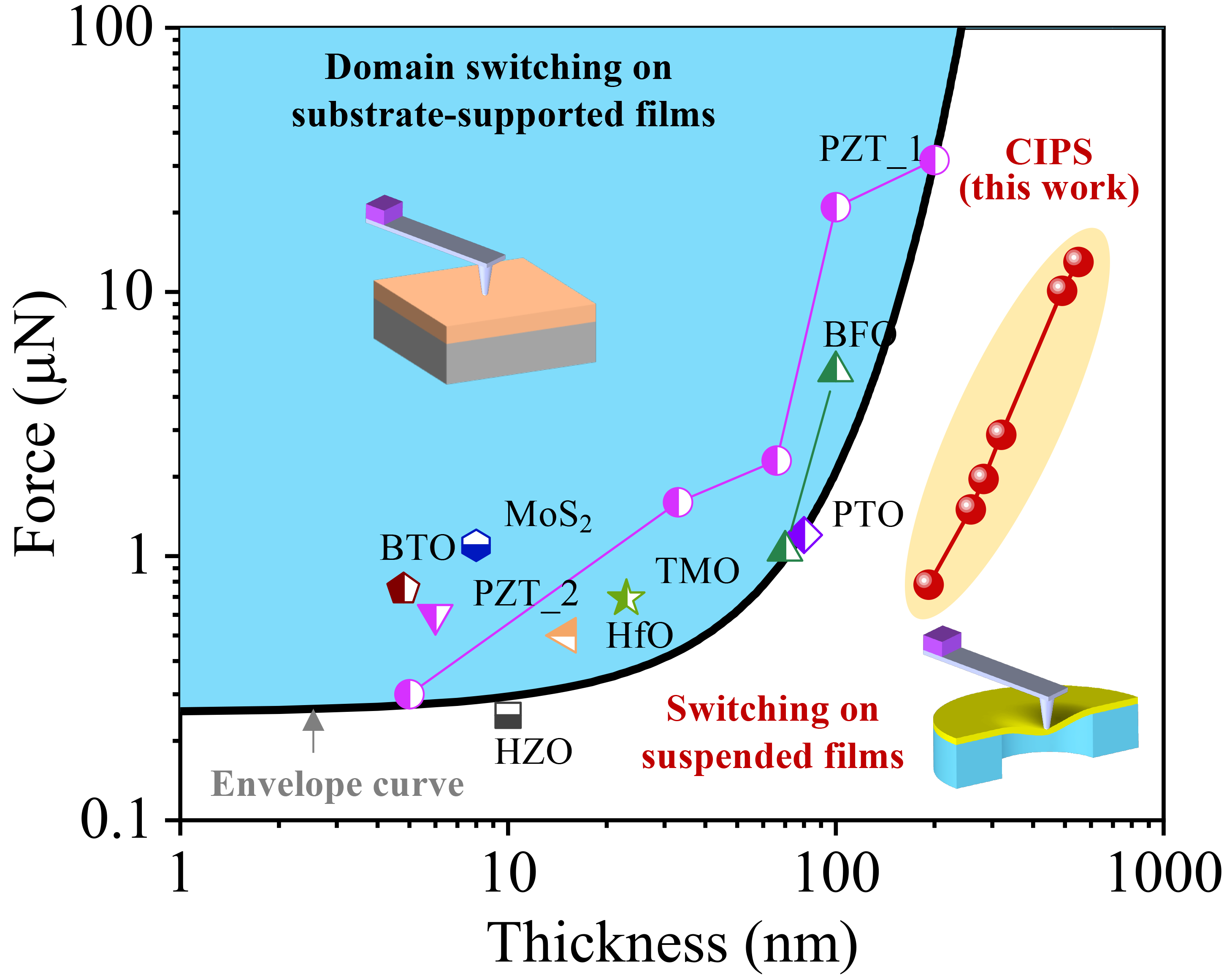 图4. 铁电畴翻转的临界力关于薄膜厚度的变化曲线。蓝色区域代表基于刚性支撑薄膜的传统调控方法,黄色区域代表基于悬浮薄膜的畴调控方法。
