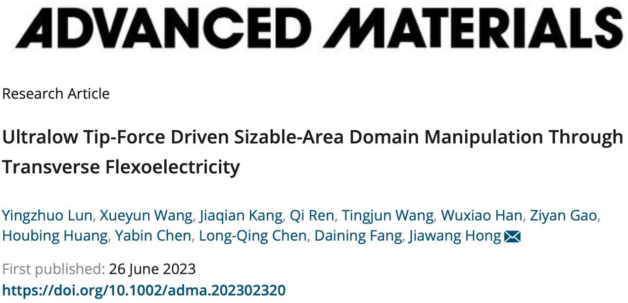 洪家旺教授、王学云副教授团队在低维材料的铁电畴力学调控研究中取得重要进展,相关成果以“Ultralow tip-force driven sizable-area domain manipulation through transverse flexoelectricity”为题发表于国际权威期刊Advanced Materials。研究团队开发了基于悬浮薄膜的针尖力调控铁电畴方法,利用悬浮薄膜在针尖力作用下的大范围弯曲变形显著增强了薄膜中的横向挠曲电场,进而在二维范德瓦尔斯铁电薄膜(CuInP2S6)中以单点针尖力实现了远超针尖-薄膜接触区域的大面积铁电畴翻转,数百纳米厚膜的铁电畴贯穿翻转所需针尖力降低至数微牛,解决了传统畴调控方式难以大面积翻转厚膜铁电畴的难题,为低维材料中铁电畴的挠曲电调控及其器件应用开辟了新途径。
