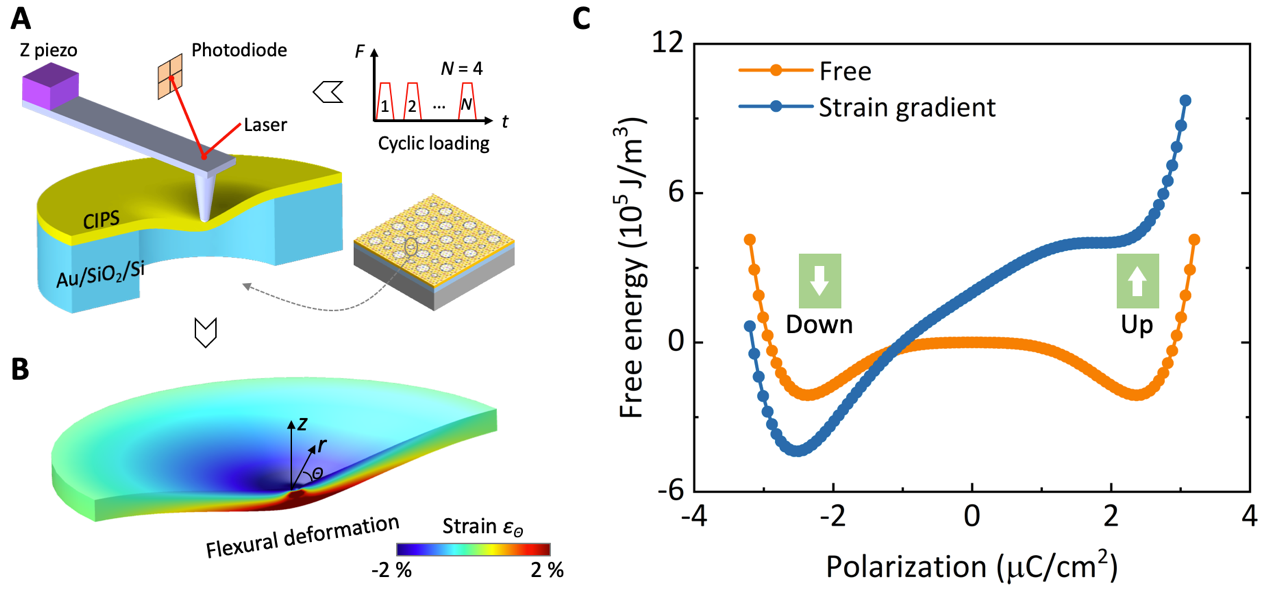 图1. 基于悬浮薄膜的针尖力调控铁电畴方法。(A)畴调控示意图;(B)薄膜面内应变分布;(C)应变梯度作用下的铁电极化双势阱曲线。