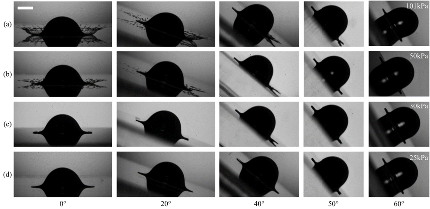 图1 表面倾角和环境压力对液滴飞溅的影响