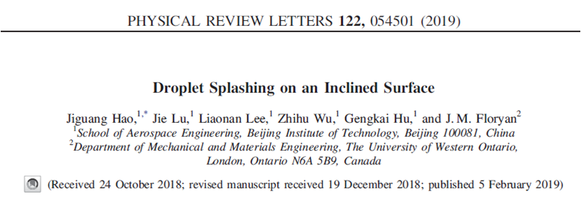 郝继光讲师、胡更开教授和加拿大西安大略大学Floryan教授合作在物理学顶级的学术期刊《Physical Review Letters》(IF="8.839)上发表了题为《Droplet" splashing on an inclined surface》的研究论文。国产av