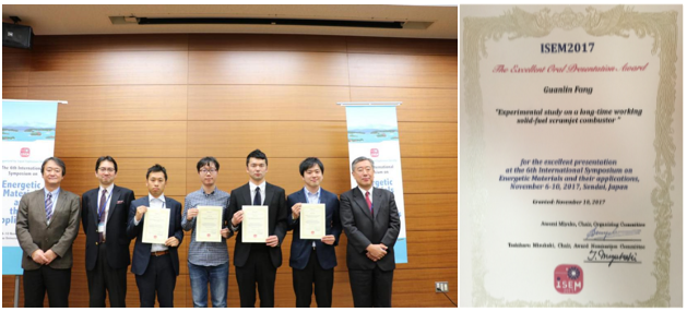 王宁飞教授特邀作为分会场主席主持会议。2015级博士生方冠林(导师:魏志军教授、武志文副教授)撰写的论文 “Experimental study on a long-time working solid-fuel scramjet combustor ”受到评审专家的高度认可,获得优秀口头报告奖(The Excellent Oral Presentation Award),该奖只有五名作者获得。此为我校宇航推进课题组在国际会议上的首次获奖,进一步提升了我校在航空航天领域的影响力。