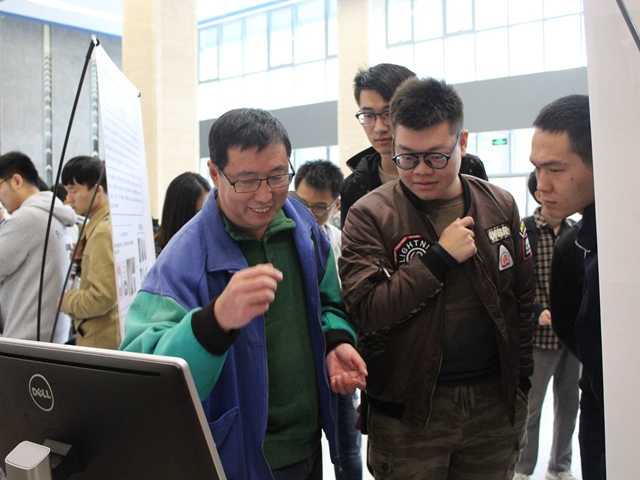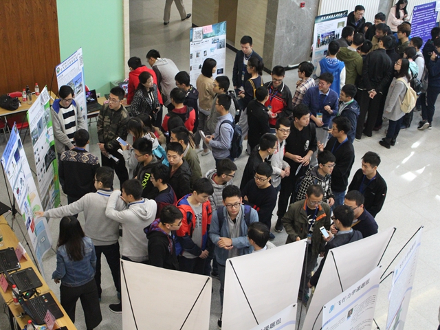 课题组的展位环绕了整个大厅。来自学院三、四年级的200余位本科生齐聚于此,或观看海报、PPT和视频,沉思于颇具震撼的研究成果中;或围绕在展位旁,与来自课题组的导师和学长沟通感兴趣研究方向。活动现场热烈而有序,前来咨询的同学络绎不绝,围绕学术兴趣,本科生和课题组之间,充分交流,相互了解,宛如一场别开生面的学术“招聘会”。