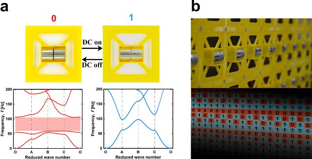 图1: a) 电磁铁控制单胞内部局域共振体吸附和分离,进而控制禁带开闭,实现0和1状态切换; b) 结合计算机技术的0和1概念,实现数字超材料。